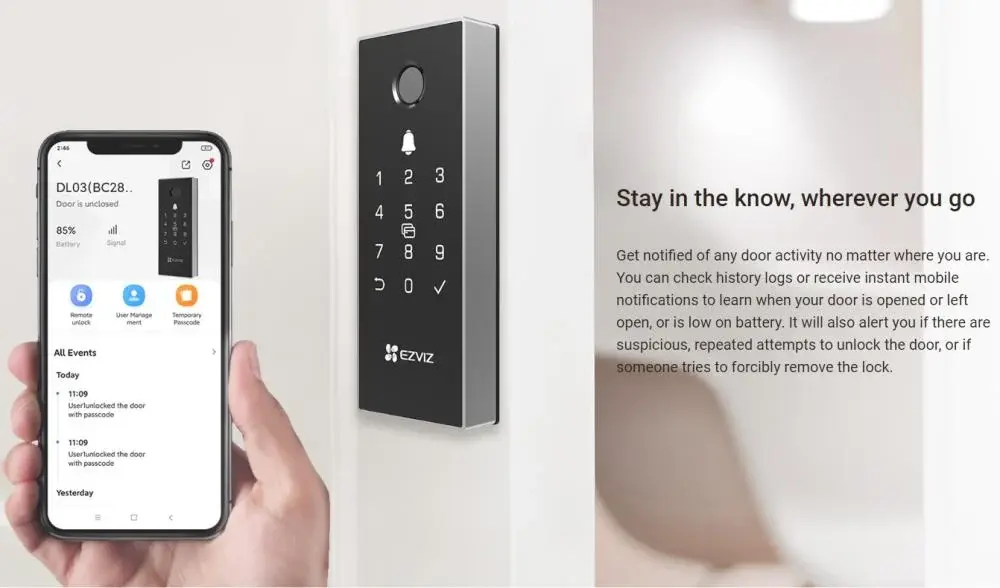 طرق فتح متعددة: يدعم ما يصل إلى 50 مجموعة من رموز المرور (6-10 أرقام لكل منها)، وبصمة الإصبع، وفتح القفل عن بُعد عبر تطبيق EZVIZ، مما يوفر مرونة لمختلف المستخدمين.